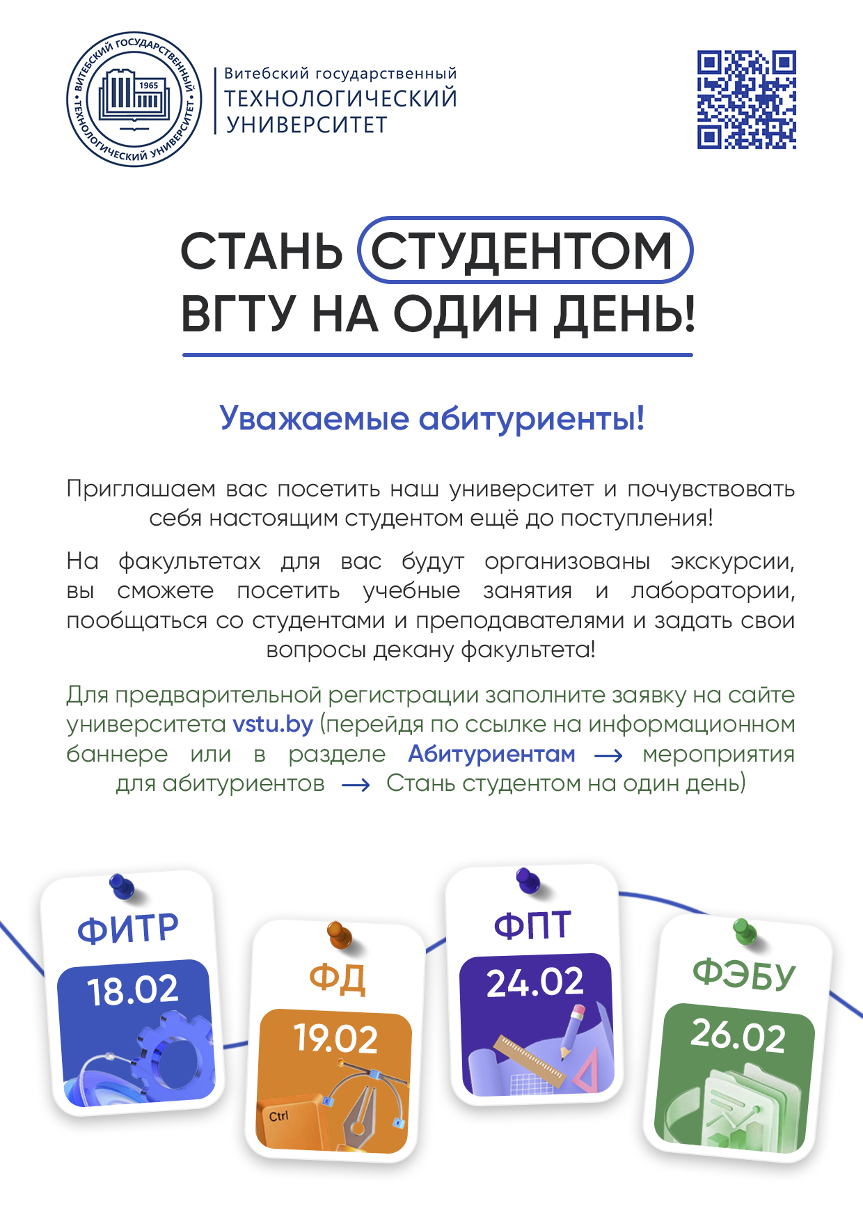 Учреждение образования «Витебский государственный технологический университет» в феврале 2026 года проводит профориентационное мероприятие «Стань студентом на один день» по факультетам.