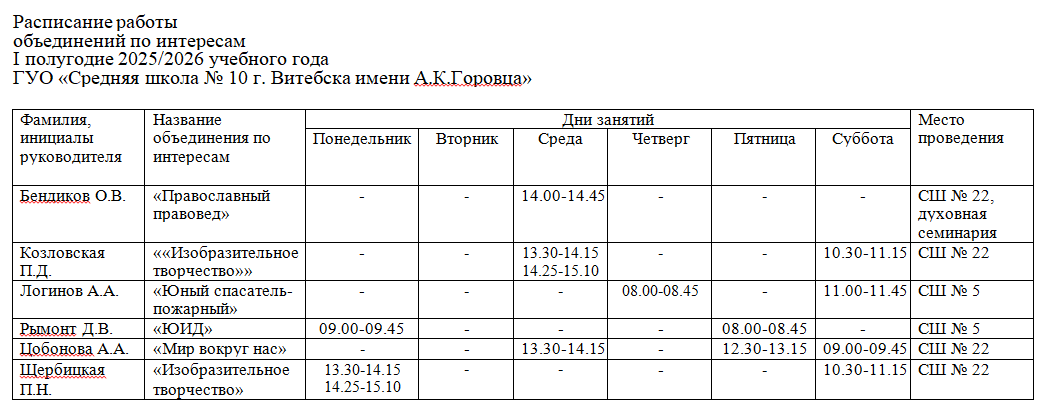Расписание работы объединений по интересам I полугодие 2025/2026 учебный год